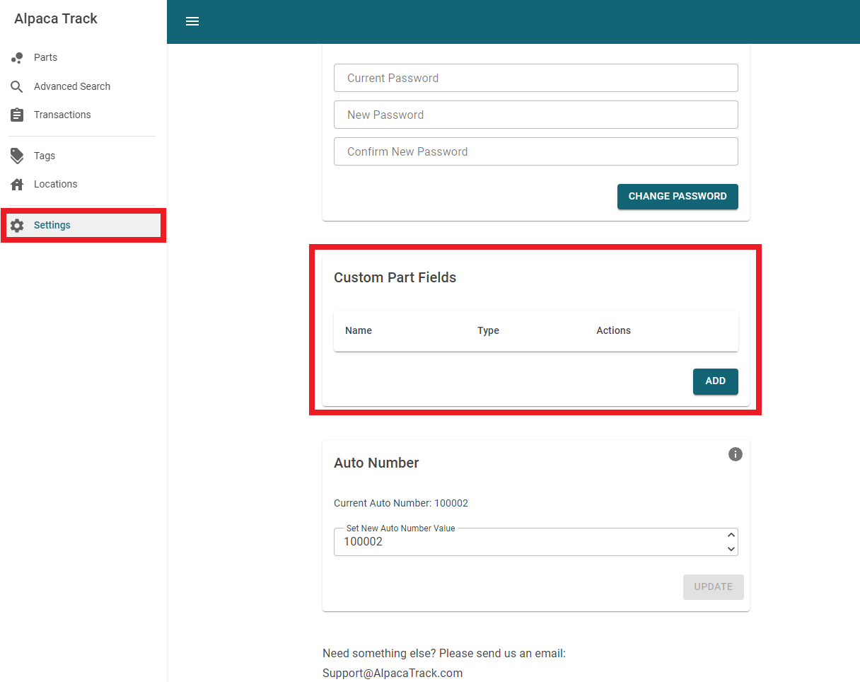 To add a custom field click on the 'Settings' menu item in the left hand navigation menu. Scroll down a little until you find the "Custom Part Fields" section.