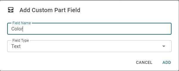 Click the 'ADD' button to show a dialog for adding a Custom Field. Give the field a name, in this case we will use "Color" to keep track of a parts color. There are two types of fields you can create, a Text type or a Number type. For our "Color" field lets select Text. Click 'ADD' to add the Custom Field.