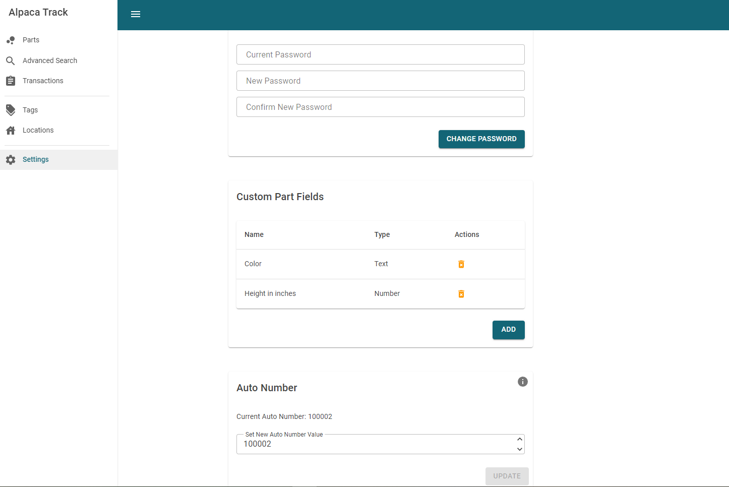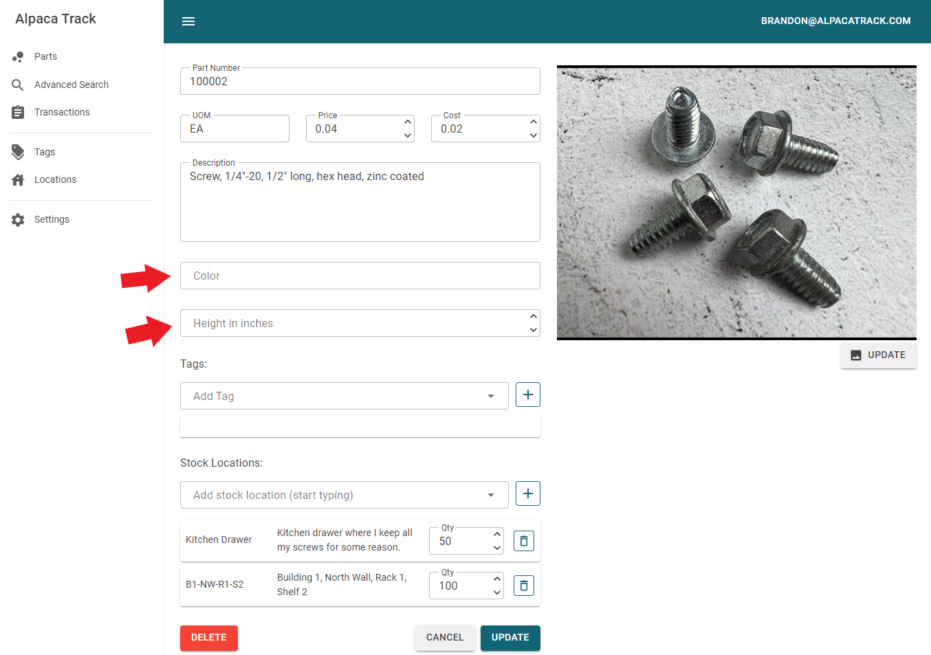 After adding the custom fields in the 'Settings' page, open the details for any part. You will now see the new custom fields available. Here we see the "Color" and "Height in inches" fields that we've just added.