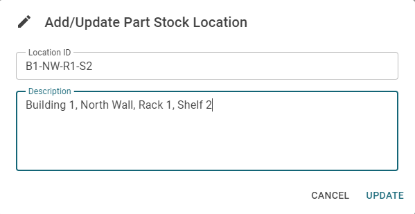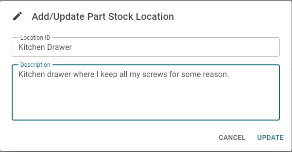 A popup dialog will appear. Enter "Kitchen Drawer" for the Location ID. You can also optionally enter a description to describe the location. When finished press the 'UPDATE' button.