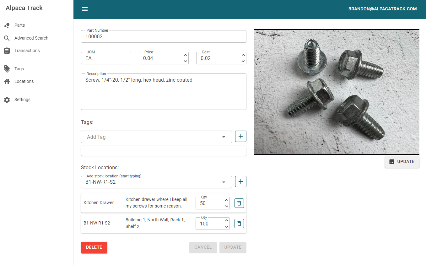To finish out this part example we will add a nice picture of some screws. Here is a what our Part Details view should look like with the two new stock locations added.
