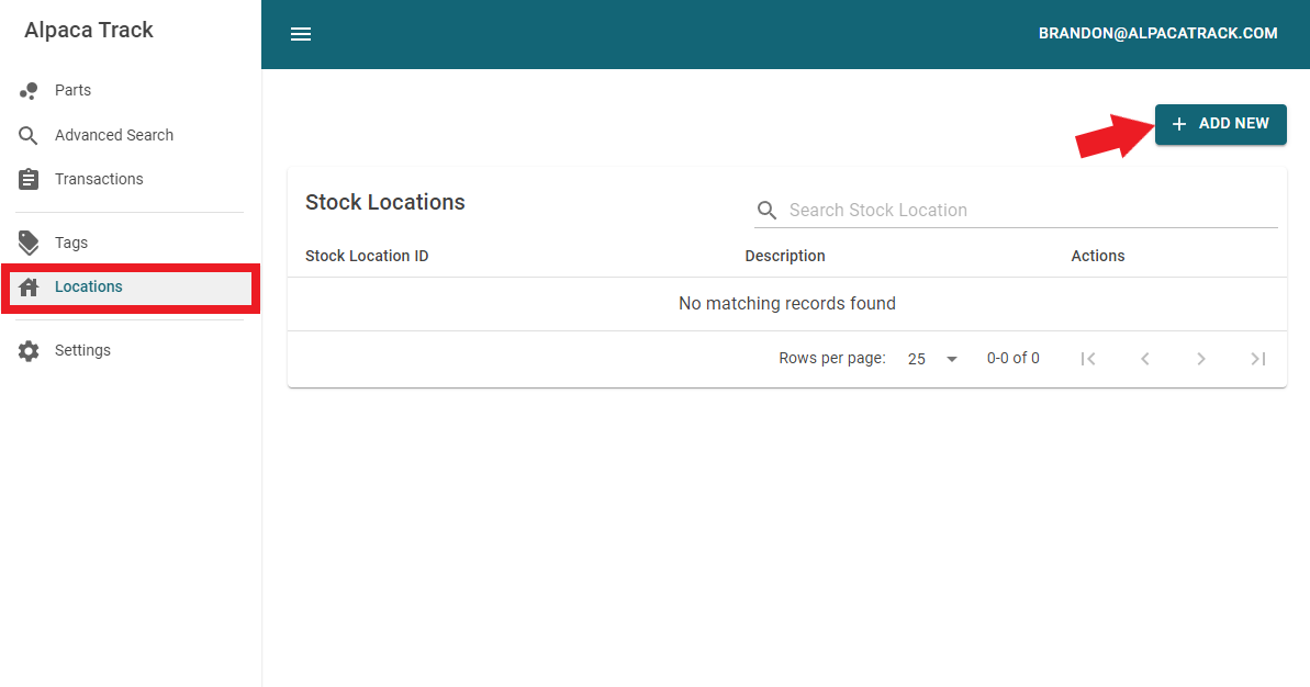 Click on the 'Locations' menu item on the left navigation menu. You start without any stock locations. Click the '+ ADD NEW' button to add one.