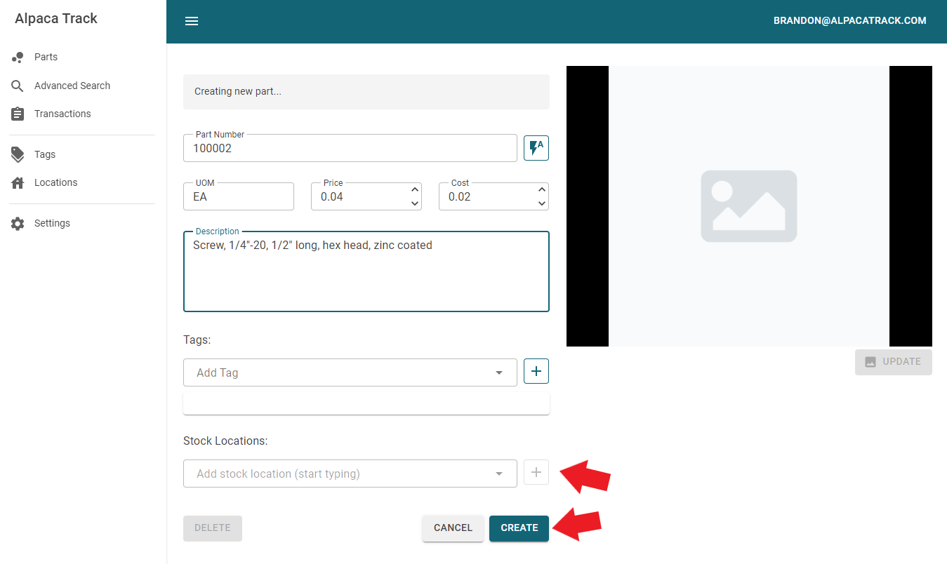 From the main 'Parts' screen, select 'Create New'. Fill in the Part Number and a Description. Notice the "Stock Locations" area of the new part is greyed out. We need to click the "CREATE" button before adding the stock locations.