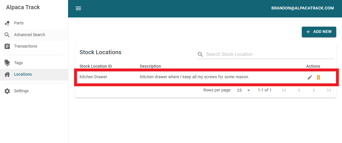 Like Tags, a Stock Location must first be defined before it can be added to a part. Lets go ahead and create a simple "Kitchen Drawer" stock location.