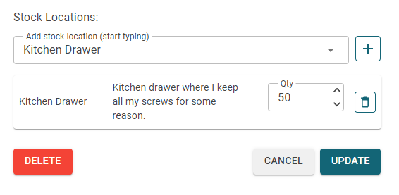 We can now change the quantity at this location. Let's enter a quantity of 50 in the "Kitchen Drawer" location. Remember to press 'UPDATE' to save the changes to the part.