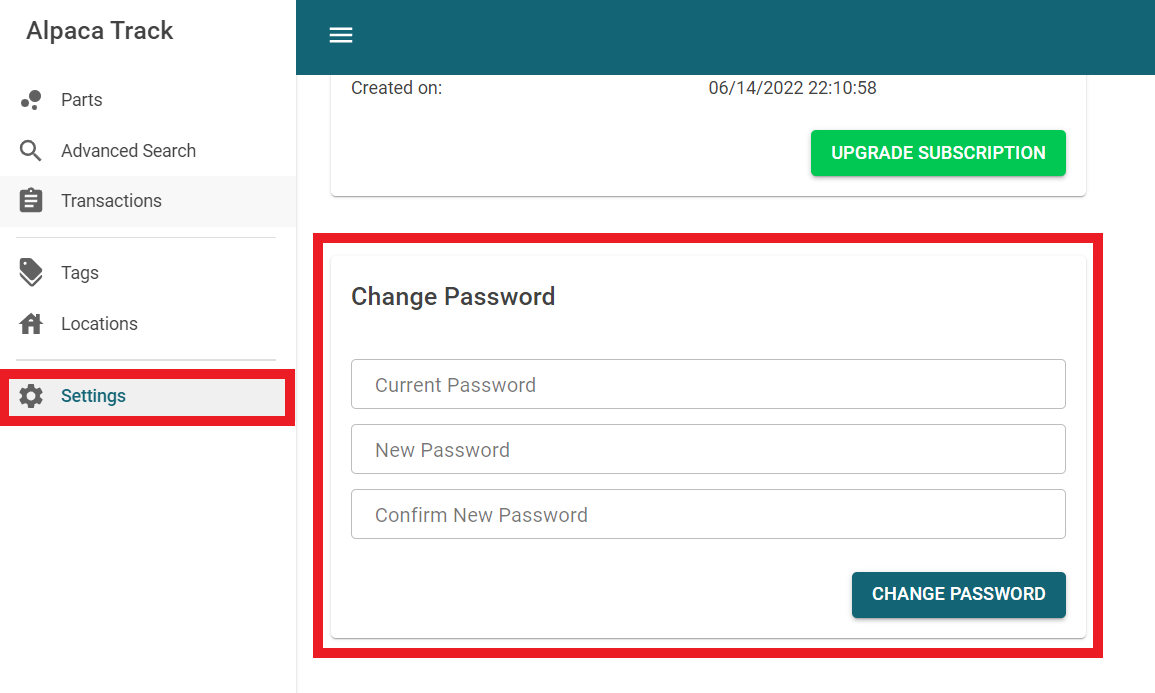 A litte farther down on the 'Settings' page you will find a section to change your password. If you have forgotten your password please contact support at Support@AlpacaTrack.com